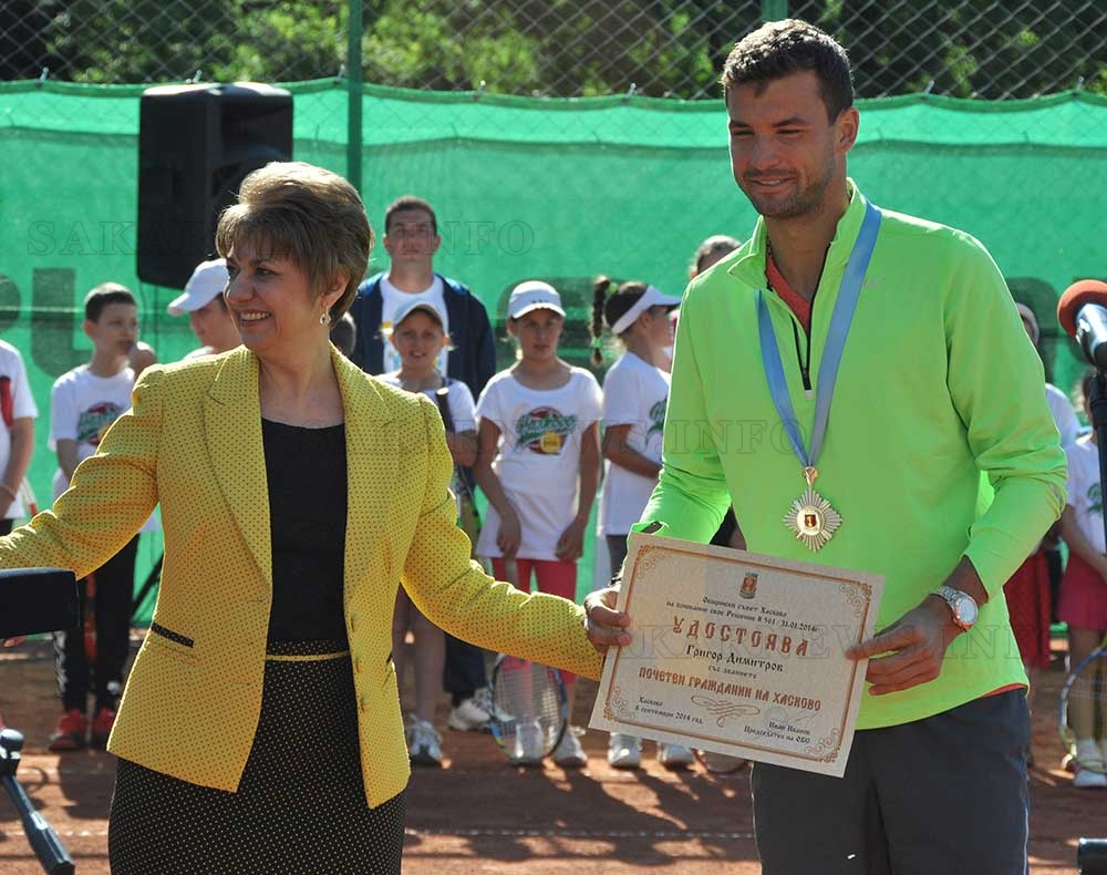Най-добрият български тенисист Григор Димитров днес получи почетния знак, с който бе удостоен за Почетен гражданин на Хасково. Званието му бе присъдено преди 2 години, а днес то му бе връчено тържествено от председателя на Общинския съвет Таня Захариева. Развълнуваният спортист каза, че за него това е най-голямото отличие, което е получавал.