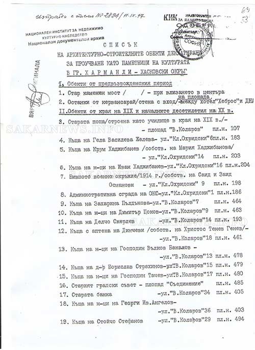 Списъкът, който от Министерството на културата публикуваха през миналата седмица, е сензацията, която накара всички централни медии да тиражират новината, че Тютюневият склад в Харманли е паметник на културата. Че лоши хора са го разрушили и само един загрижен гражданин е сигнализирал за това. В списъка на Министерството са изписани адресите на 39 сгради на територията на Харманли. Процедурата по определянето им като паметници на културата не е завършена и не е издаден документ, че са такива. В същото време в регистрите на ведомството не фигурират такива емблематични сгради като бившето кино и други тютюневи складове.