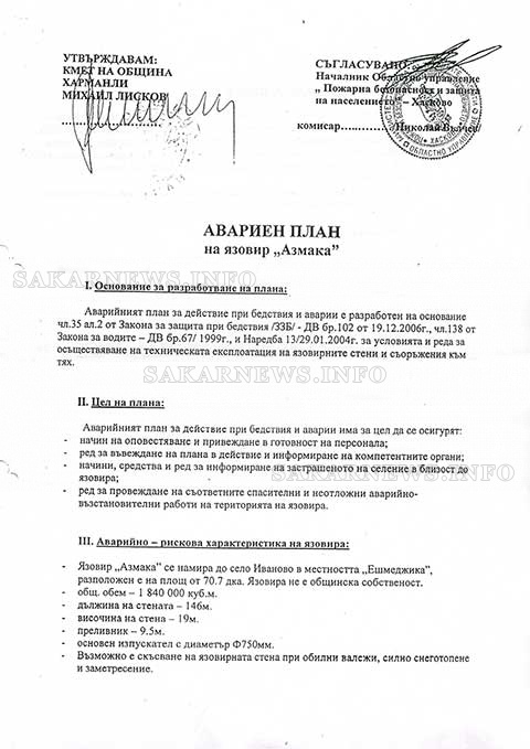 Аварийният план е съгласуван с началника на Областно управление на ПБЗН – Хасково. Определени са отговорни лица: кметът на Иваново – Недко Димитров, и колегата му от село Бисер – Павел Павлов. От ноември 2011 година и двамата не са кметове на тези села, но по-нов авариен план не е известно да има.