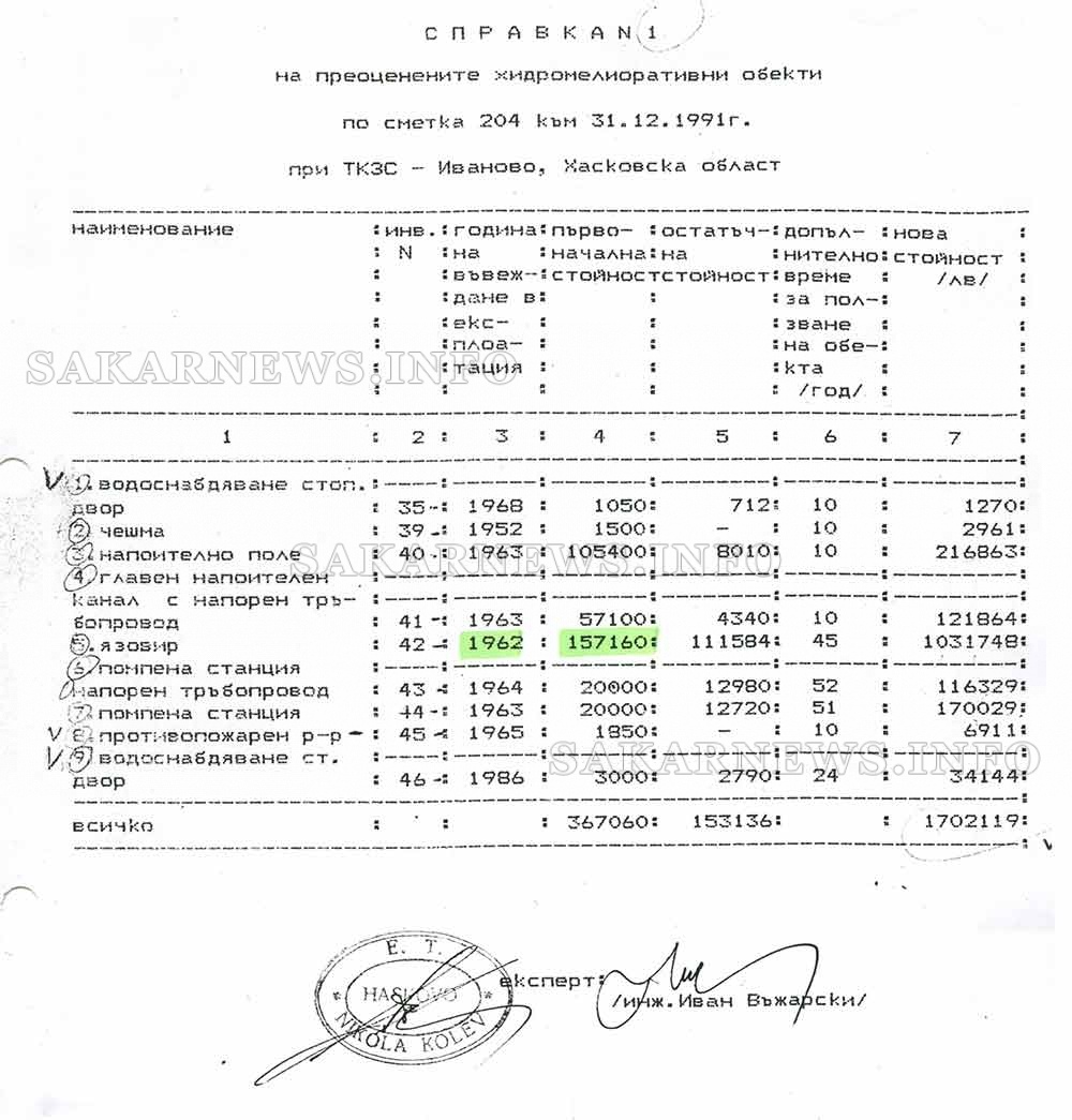 Това става ясно от справка №1 към 31.12.1991 г. на ТКЗС „Иваново“, където е списъкът на преоценените хидромелиоративни обекти по сметка №204. В нея е записано, че